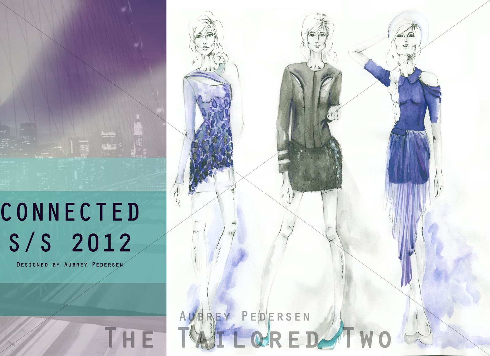 Aubrey: The pictures below are two separate collections, the first being for a contest inspired by New York and the second is a collection inspired by the image of a moth for a sustainable collection. The first collection, Connected, is about the idea of "the dream", this is what a person is trying to connect to when the come to the Big Apple. You, our dear readers, can look forward to more from this collection because I am been made a finalist in an amazing competition for Elle magazine. The mediums are watercolor and Photoshop.